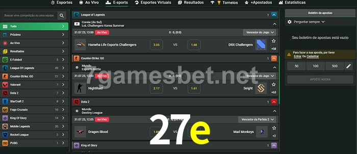 O 27e oferece uma grande seleção de opções de apostas em e-sports com probabilidades competitivas
